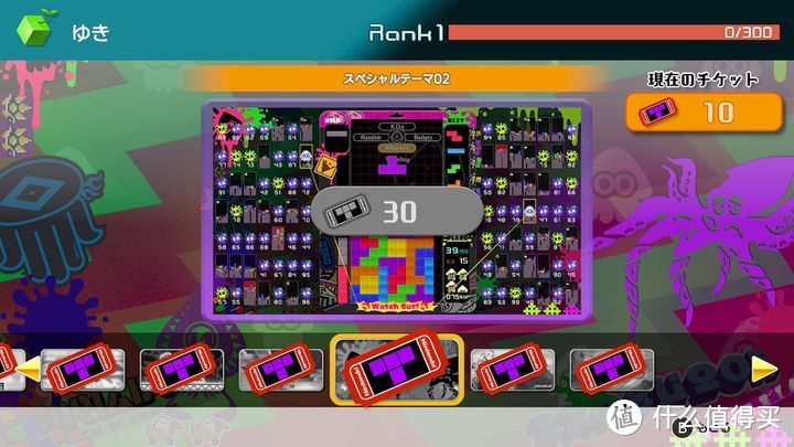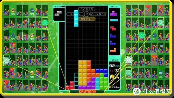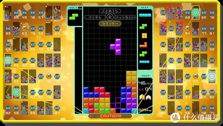 《俄羅斯方塊99》顯然是受到最近流行的“大逃殺”式游戲的啟發,在游戲核心系統基本保留的情況下,引進了對抗機制。跟以往4人左右的網絡聯機不同,這次對戰的人數直接上升到99人,刺激程度大大加強。同時,配合Switch的HD震動機能,方塊下降消除的時候震動反饋也讓人覺得非常有成就感。加上官方時不時更新跟新游戲聯動的主題皮膚,使得游戲新鮮感得以保持。