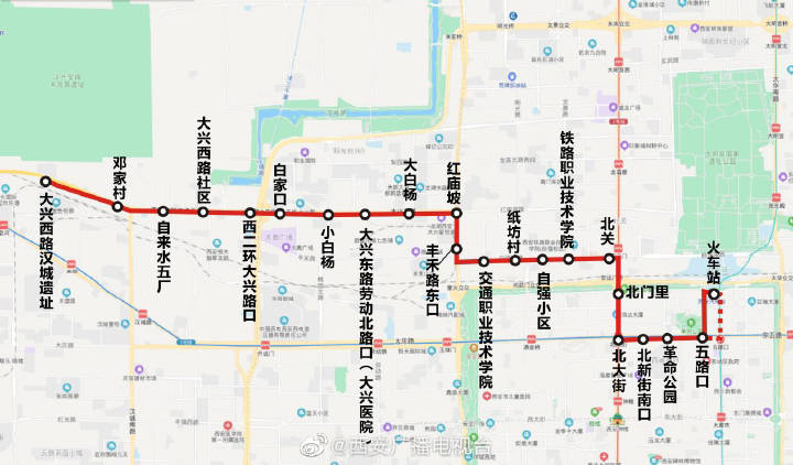 線路設置站點22個:大興西路漢城遺址、鄧家村、自來水五廠、大興西路社區、西二環大興路口、白家口、小白楊、大興東路勞動北路口(大興醫院)、大白楊、紅廟坡、豐禾路東口、交通職業技術學院、紙坊村、自強小區、鐵路職業技術學院、北關、北門里、北大街、北新街南口、革命公園、五路口、火車站。