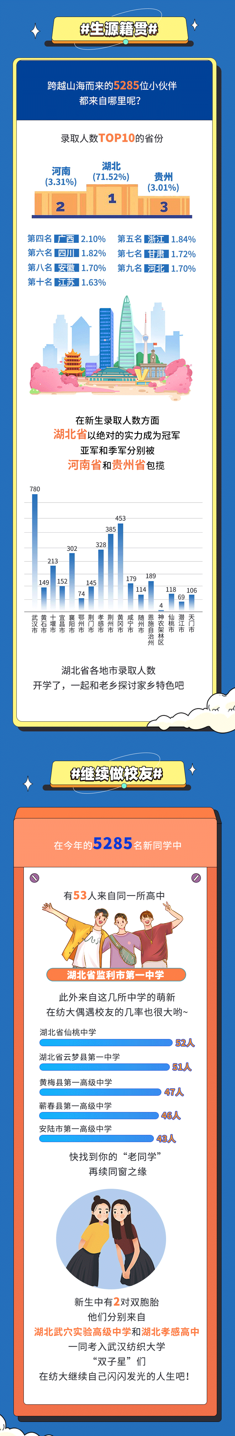 導讀【來源武漢紡織大學】8月27日,武漢紡織大學官微公布了2023級新生大數據今年總共有5285位新生加入紡大湖北、河南、貴州為錄取人數TOP3的省份其中,年齡最小的新生15歲年齡最大的新生23歲 聲明
