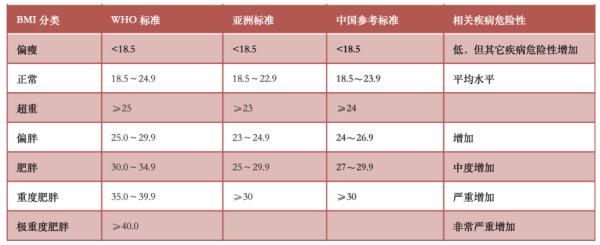 對于BMI值,世界衛生組織曾定下了全球標準。不過,亞洲人和歐美人屬于不同人種,WHO的標準不是非常適合中國人的情況,為此有了中國參考標準:③