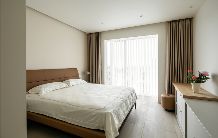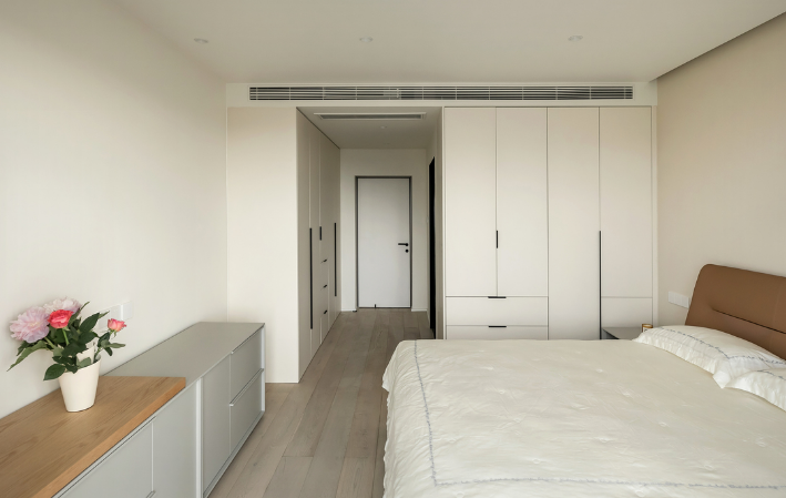 大面積的儲物柜設計,為主臥提供了充足的收納空間。整體延續了溫柔的奶茶色系,營造干凈舒心的睡眠氛圍。