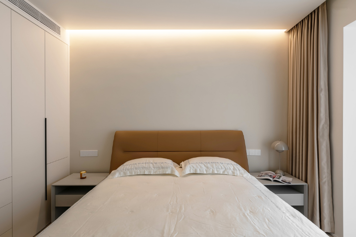 本著設計不干預生活的理念,主臥去除多余裝飾造型設計,只保留了最基礎的配置,回歸空間睡眠本質。臺燈+隱藏暖色燈帶設計,打造干凈整潔背景墻,同時不影響起夜照明。