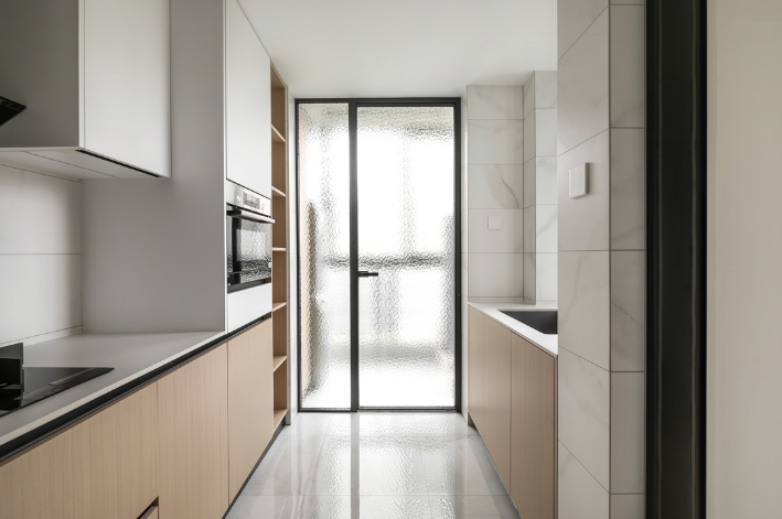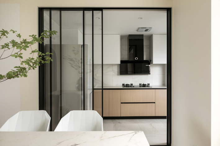 廚房為創造更明亮開闊的下廚環境,選用1.6米的三扇細框折疊門設計,劃出餐廚界線的同時,隔絕油煙保持采光。