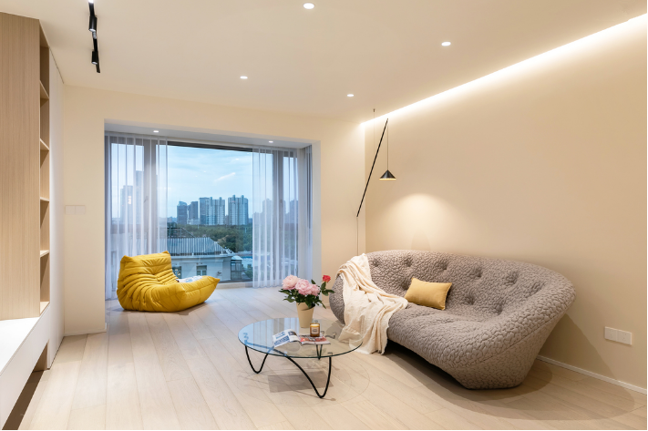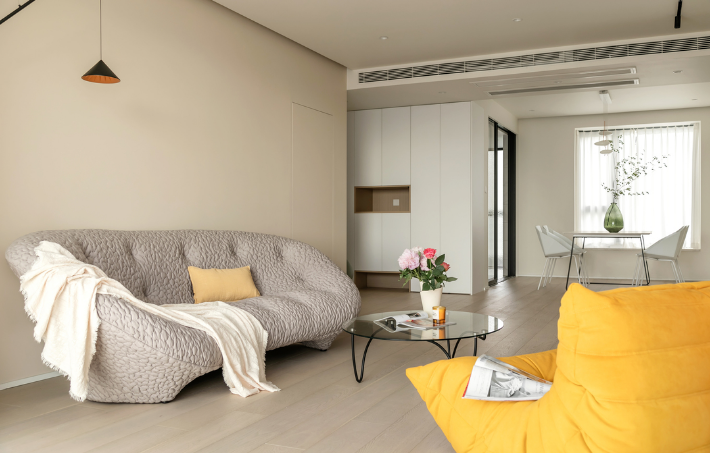 客廳溫馨舒適且寬敞,背景墻以暖色系為主,呈現出溫柔的奶茶色效果,甜而不膩讓人感到舒適。陽臺封閉納入客廳,換來一面寬2.1米,高2.4米的無隔斷落地窗,改善采光的同時引景入室,提高居住品質。