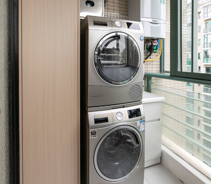 緊挨著廚房的生活陽臺,一組小尺寸的儲物柜設計,搭配洗衣機和烘干機,以及一個小尺寸的手洗池,簡潔高效。