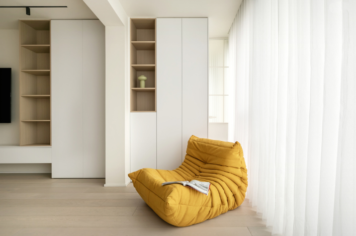 改造后得到的無隔斷落地窗,不論是視野還是采光,都得到質的提升。舍棄傳統布藝窗簾,改用夢幻簾,葉片之間以柔紗連接,為空間疊加柔和光感,營造出愜意無拘束的空間氛圍。
