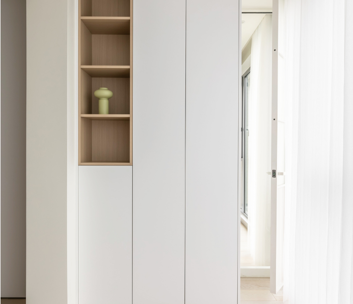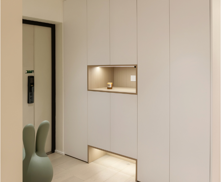 整體白色+局部鏤空原木色的組合,消弭了整面柜子的單調厚重感。中間鏤空部分可以放置鑰匙、包包等物品,底部鏤空設計,則擺放日常更換的鞋子,保持空間整潔。