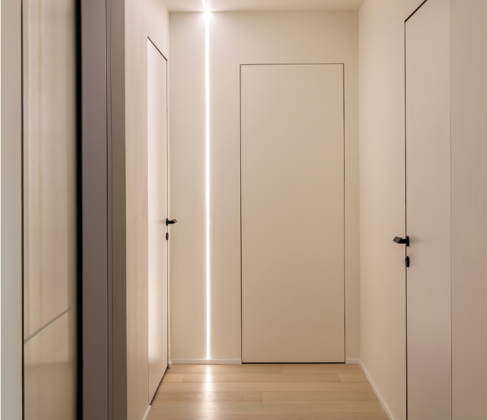 過道采光不佳,提前規劃嵌入式LED燈帶,光面順應墻體翻折接續,有效放大空間感,同步做弧形設計,淡化直角銳利感。