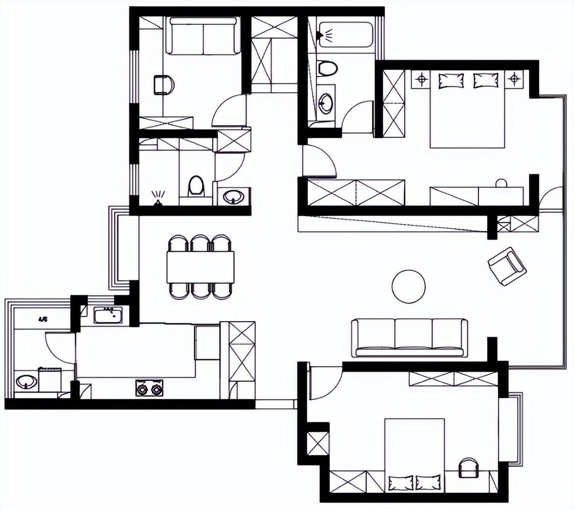160㎡三房兩廳格局,三口之家居住空間還是很充足的。原戶型缺點還是蠻多的,比如玄關空間太窄,收納空間嚴重不足;陽臺空間利用率不高,且影響采光;過道盡頭集中主臥、書房、客衛、儲物間的入口,略顯雜亂;客衛空間一體,影響日常使用。