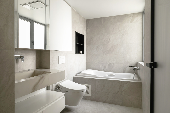 主衛采用仿石紋瓷磚,墻地一體通鋪,簡潔大氣有質感。巖板一體臺盆+壁掛式馬桶+一體式浴缸+壁龕設計,提升生活品質感。