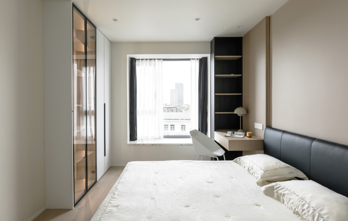 次臥依舊是簡約基調,依據實際需求打造出現有格局配置。床頭采用不對稱設計,靠近窗戶打造成書桌,另一側則利用高柜架構出ㄈ形立面,提高收納的同時,也兼顧床頭置物。