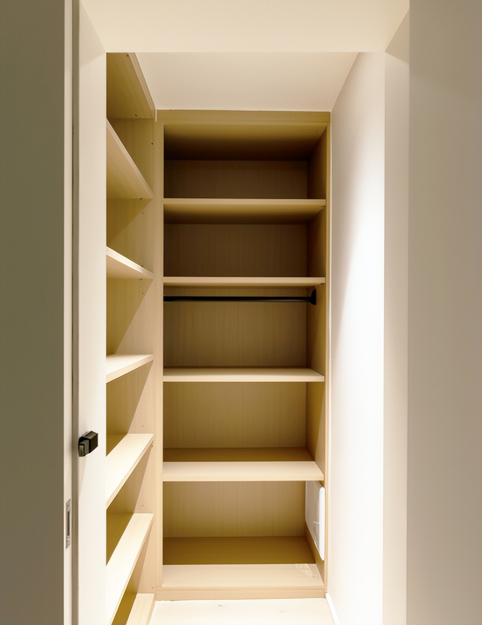 過道盡頭是一個不到6㎡的儲物間,采用開放式層架設計,方便擺放大件物品,比如行李箱和換季的被褥等。