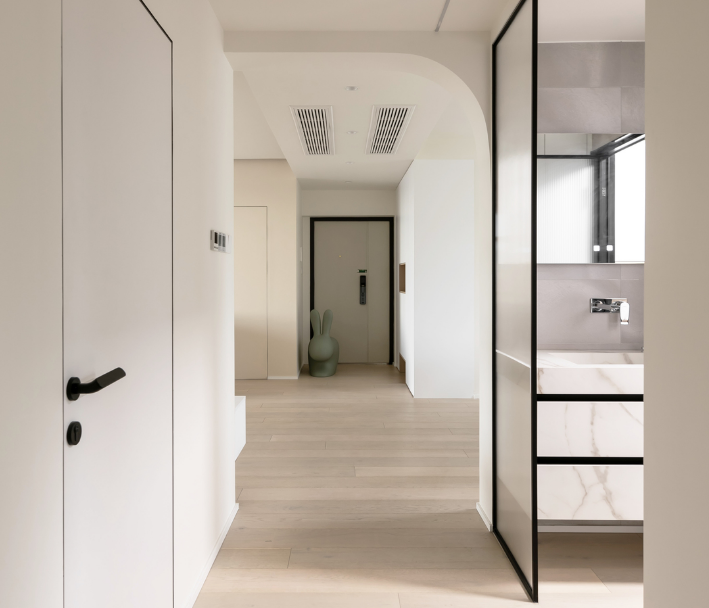 由于過道盡頭匯集多個房間入口,于是采用隱形門設計,呼應線條感,同時也弱化空間雜亂割裂感。