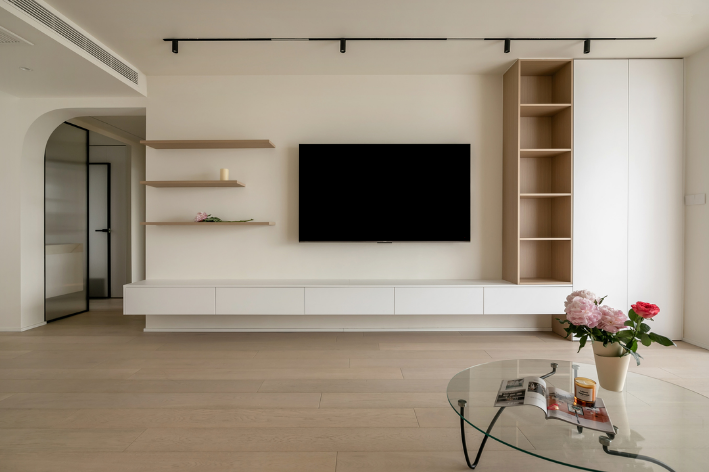 電視墻延續了原木+白的配色方案,純凈自然、質樸舒適。收納設計采用二八法則,八分藏兩分露,優化視覺比例,不顯呆板沉悶。