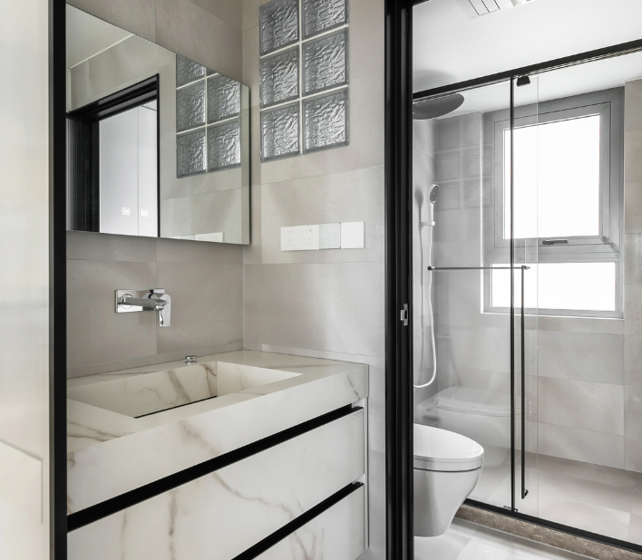 原本空間一體的客衛,改造后變成了干濕兩分離的格局。洗手臺外置過道,并用長虹玻璃實現與過道間的隔斷。新建干濕隔斷墻嵌入了玻璃磚,引入衛浴光線改善過道采光。