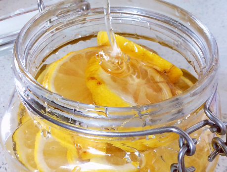 第四步,將涼白開倒入其中,需要完全沒過檸檬片才可,將容器的口封好,將其放入冰箱中開始冷藏,經過一晚上的時間,將容器從冰箱中取出;