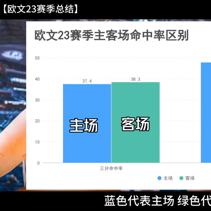 這是23賽季歐文主客場命中率的圖表,藍色代表主場,綠色代表客場。你可以看出,歐文在客場的命中率要比主場更準,無論整體命中率還是三分命中率。