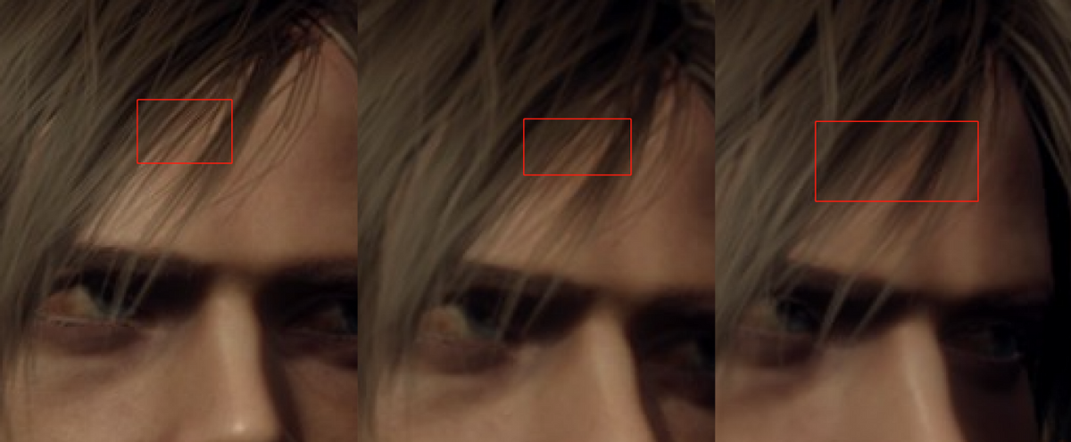 從全局看,三者的差別已經很小,而在放大500%的細節圖中,我們可以看到,原生和FSR2.1畫質下,里昂的發絲在最新發絲渲染技術下,飄逸自然,分毫畢現,且在邊緣鋸齒方面,FSR2.1甚至于略好于原生畫質!而FSR1則在發絲、發束邊緣有比較明顯的鋸齒效應。