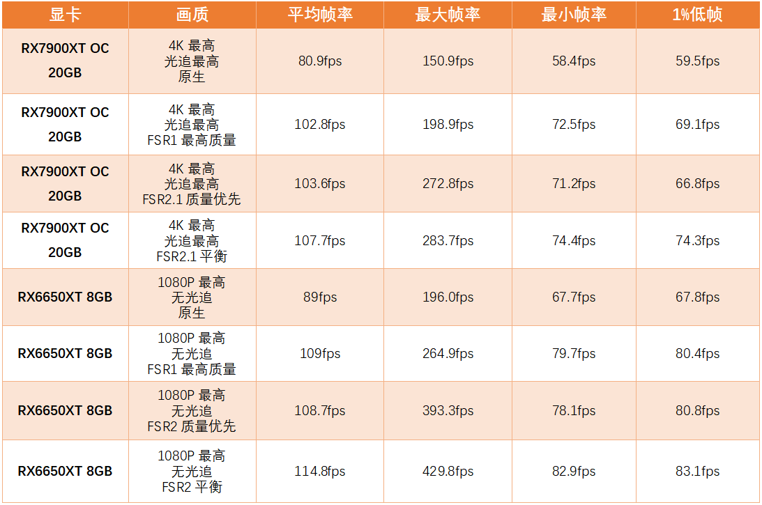 從測評表現來看,AMD RX6650XT和RX7900XT兩張定位不同的顯卡,面對《生化危機4重制版》這樣的年度最新3A大作,在FidelityFX CACAO和FSR1.0/FSR2.1等技術的加持下,都能非常好地完成畫質與流暢度兼得的游戲體驗人物。