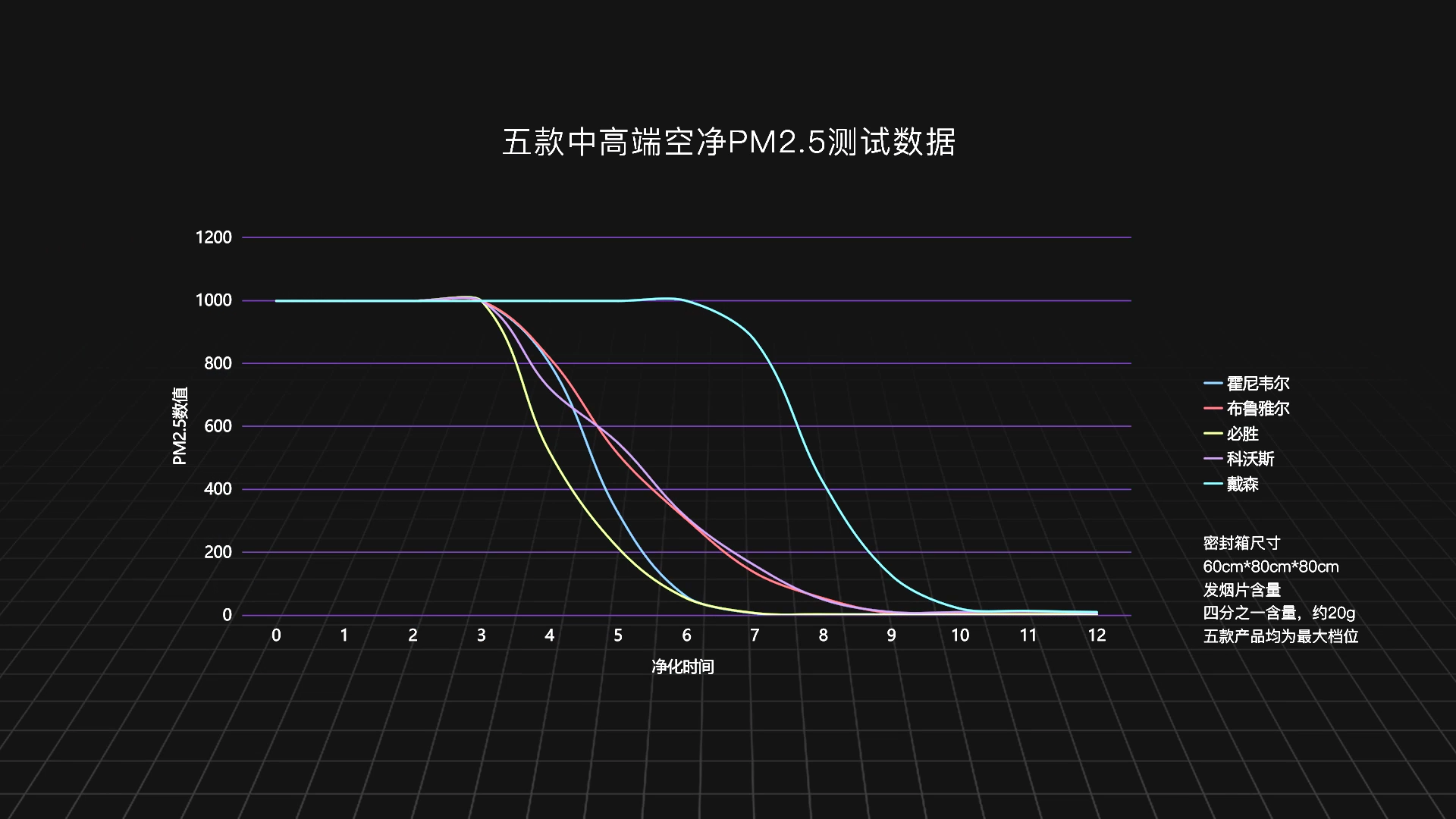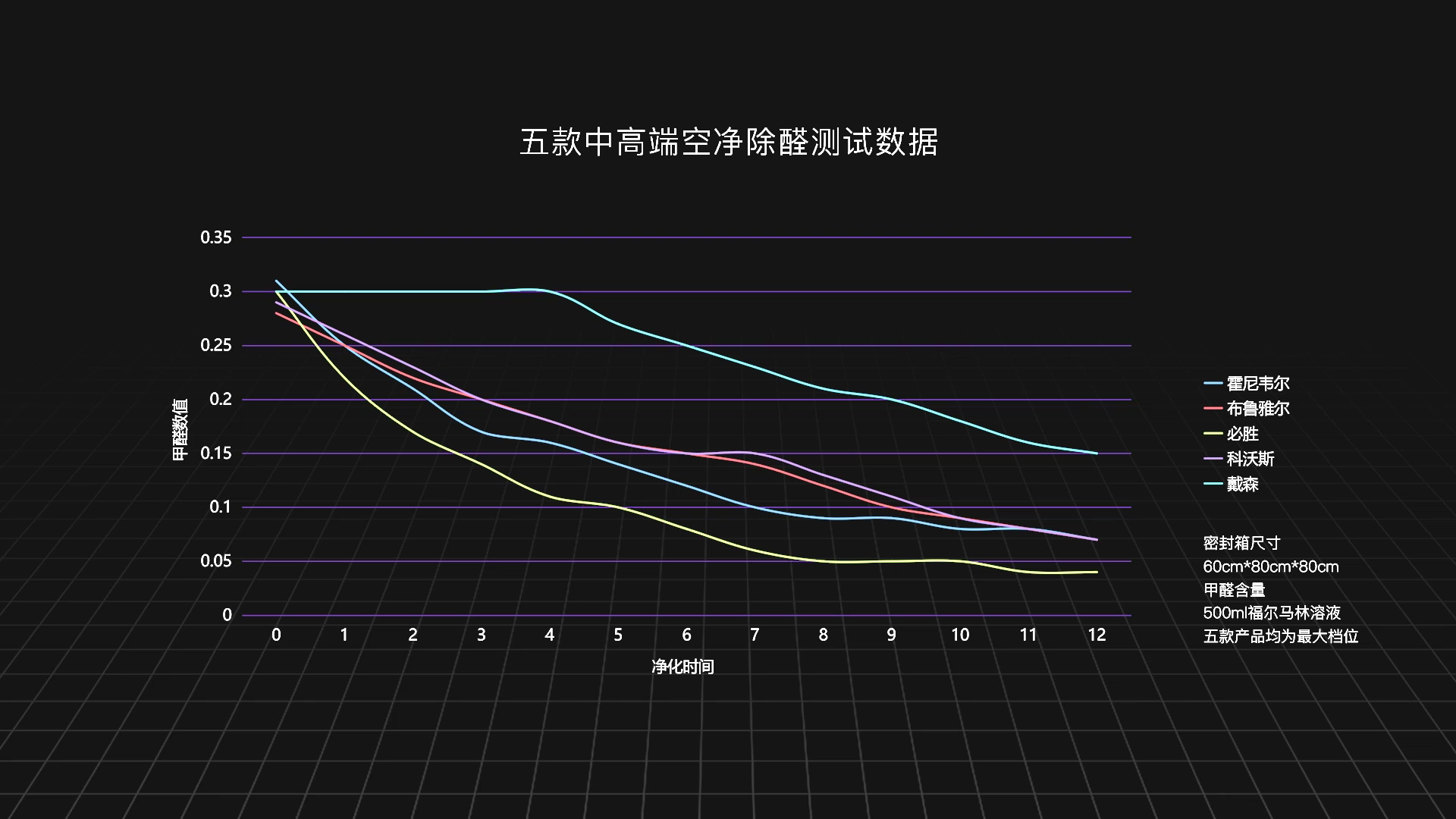 其中凈化效率最快的是這條黃色的線,也就是必勝,6分鐘的時間降到了國標0.08以下。霍尼韋爾、布魯雅爾、科沃斯這三款的凈化效率比較接近,降到國標之下都花費了10分鐘左右。最后是戴森,前5分鐘幾乎沒有動靜。還是那句話,作為一臺風扇,太難為它了。