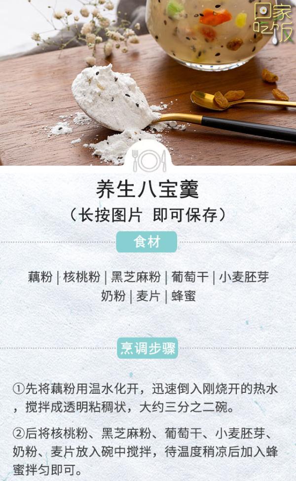 這款八寶羹能做早餐,有助于補肝腎、益氣血、健胃生津、美容減肥,對于便秘的老年人特別有好處。