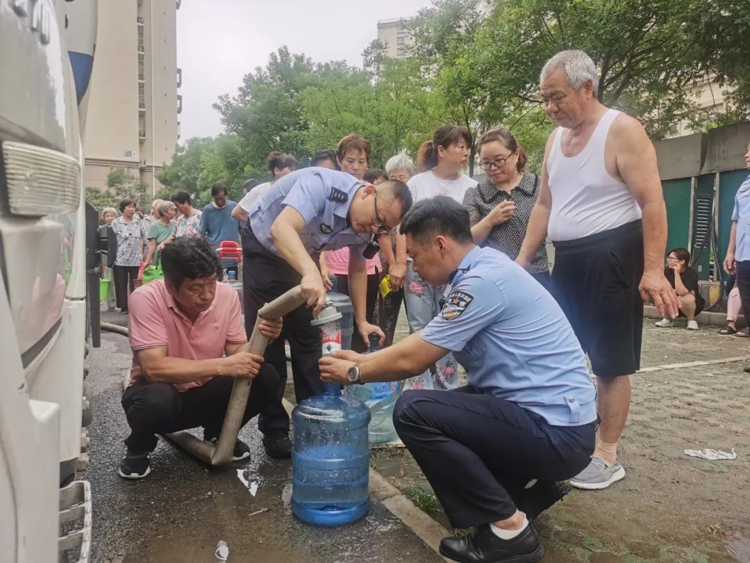 在青龍湖鎮,一小區內供水緊缺,為了解決用水困難的燃眉之急,政府協調安排了4輛送水車,8月3日一大早,民警和送水車就到了小區。