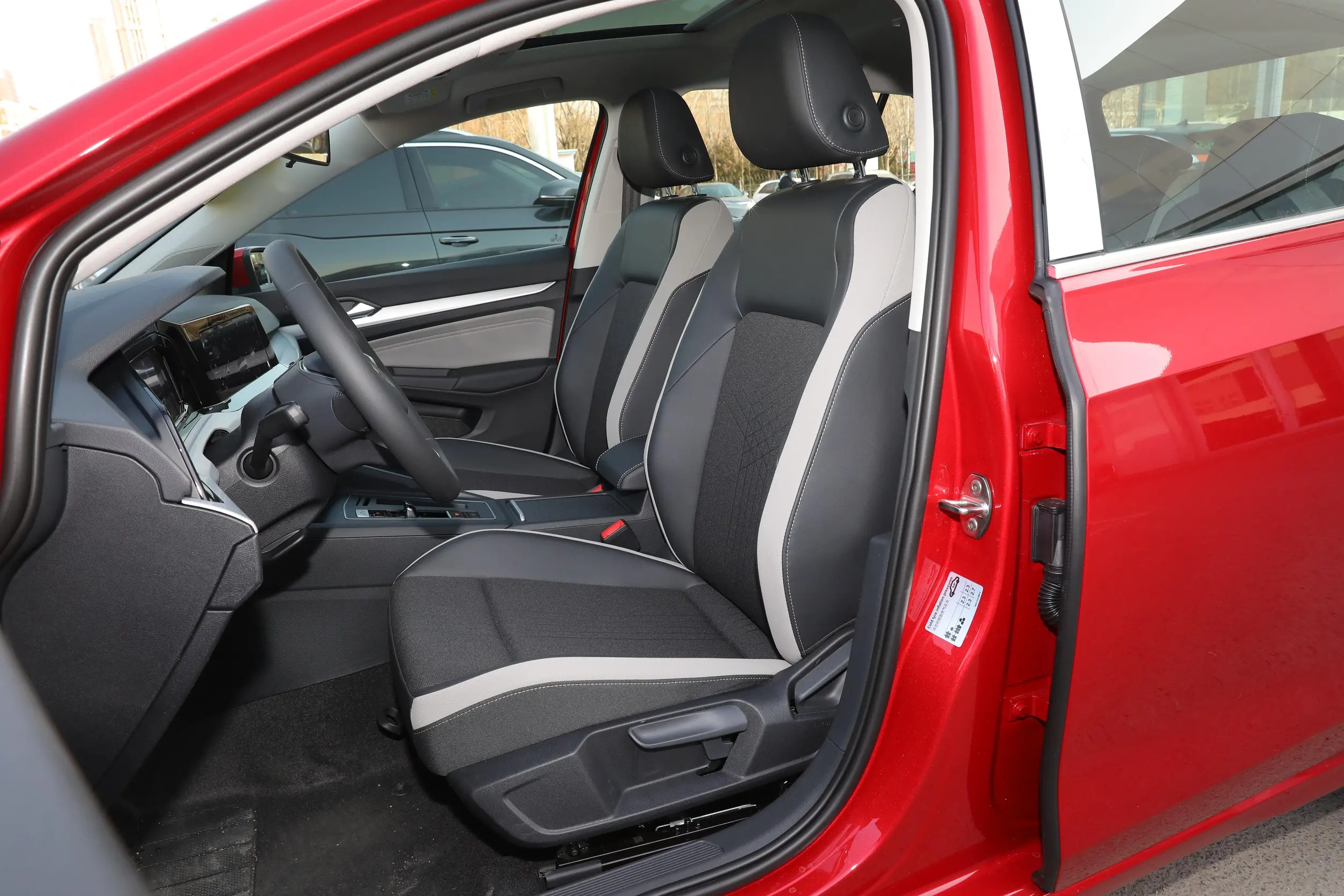 大眾高爾夫2023款 200TSI DSG Pro版本,座艙選用皮質混搭座椅,主副駕駛位手動6向調節,座椅設計很有家族味道,非常規整,側翼對身體很契合,上方還帶有天窗。