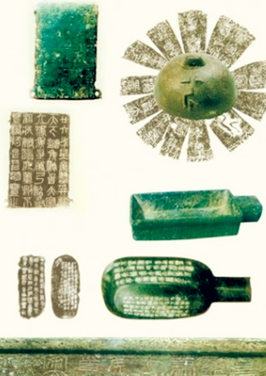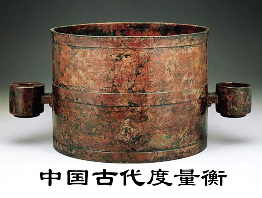 臺灣故宮博物館保存的新莽銅嘉量,將度量衡這三個單位非常巧妙地組合于一個器物之上,器型有斛、斗、升、合、龠五個量,工藝相當復雜,采用的圓周率是3.1547。斛為主體,斗為圈足,左右耳分別為升與合,下為龠。每個量都有詳細的分銘,記著各個器物的大小和容積。