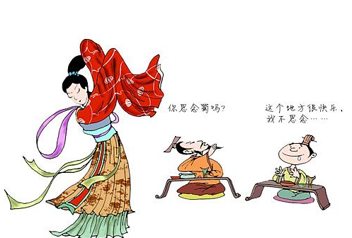 有一次,他請劉禪喝酒,席間叫人為劉禪表演蜀地樂舞。跟隨劉禪的蜀國人看了都觸景生情,難過得直掉眼淚。司馬昭看看劉禪,見他正咧著嘴看得高興,就故意問他:&34;你想不想故鄉呢?&34;劉禪隨口說:&34;此間樂,不思蜀。&34;意思是:&34;這里很快樂,我并不想念蜀國。&34;