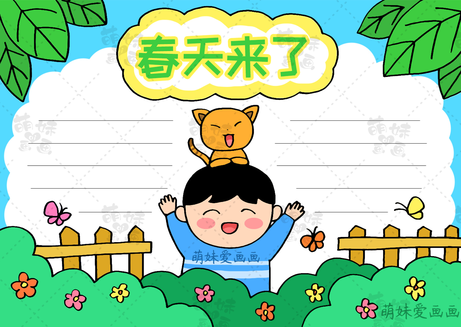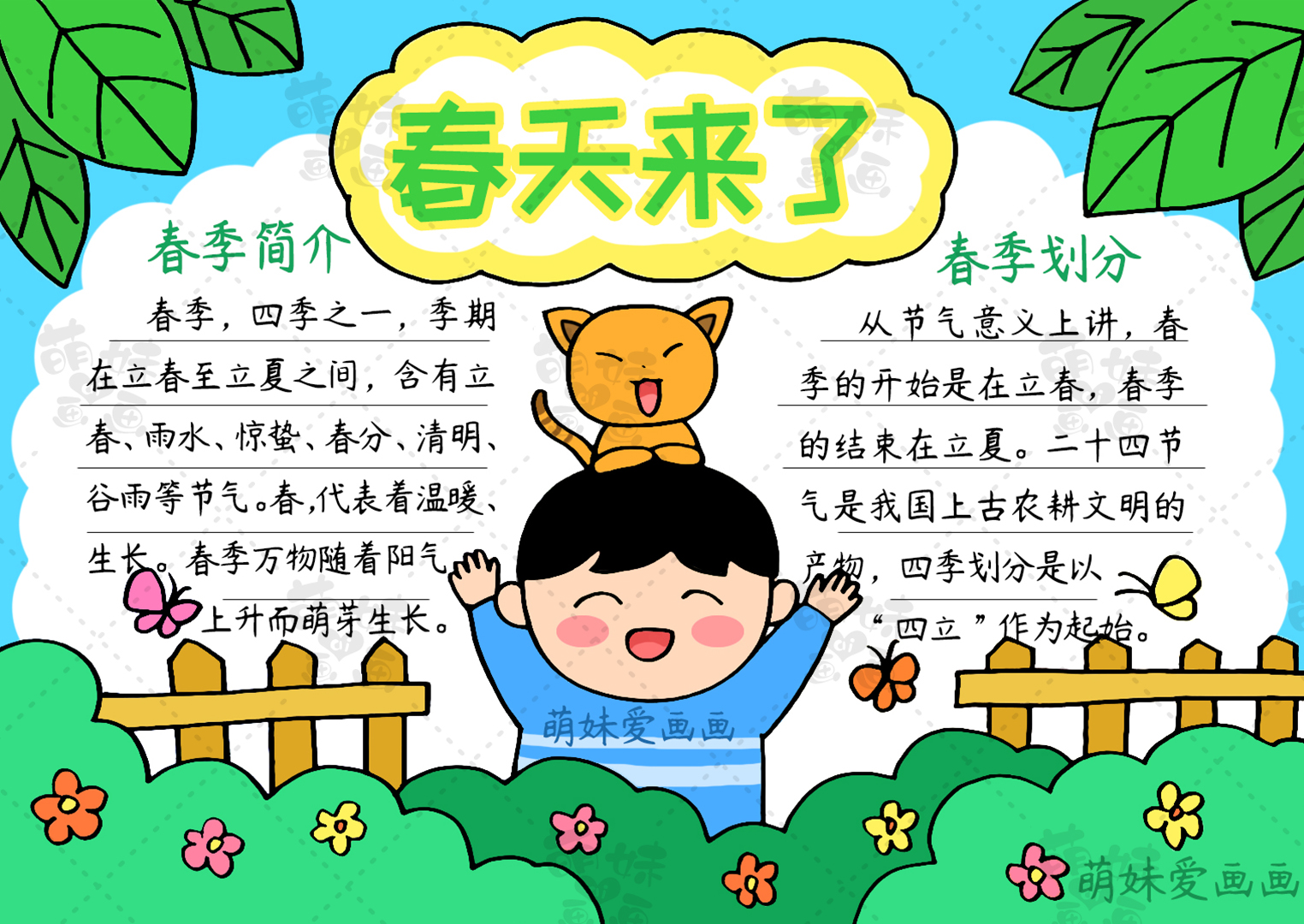 我們在畫面中間繪制一位迎接春天的小男孩和小貓,這樣的搭配簡單又好看,大家喜歡這樣的手抄報嗎?