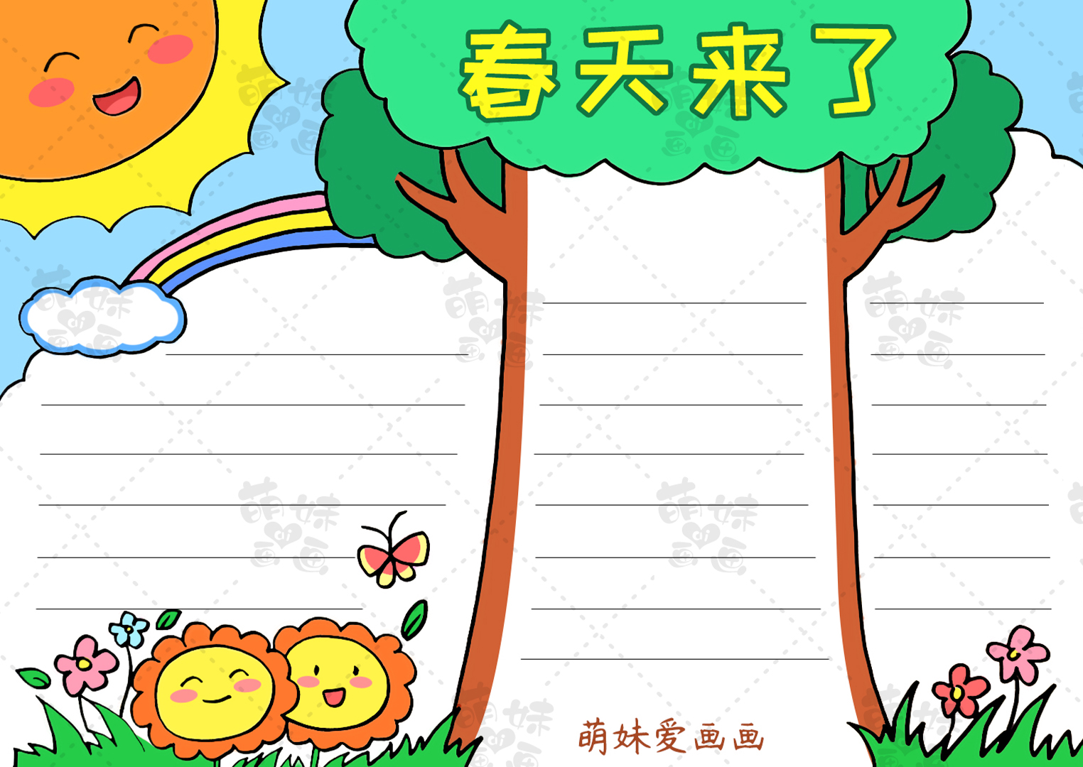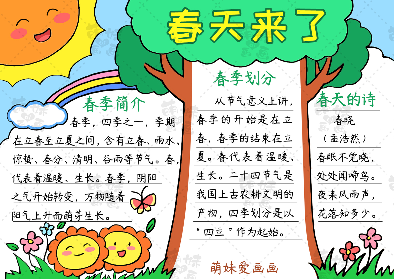 導讀春,代表著溫暖、生長。春季,陰陽之氣開始轉變,萬物隨陽氣上升而萌芽生長。今天萌妹老師給大家帶來一組含文字內容的春天手抄報模板及簡筆畫合集,簡單又漂亮,希望能幫助到大家哦。第一款手抄報春天大樹手抄報我