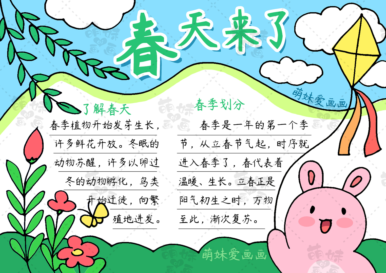 春,代表著溫暖、生長。春季,陰陽之氣開始轉變,萬物隨陽氣上升而萌芽生長。今天萌妹老師給大家帶來一組含文字內容的春天手抄報模板及簡筆畫合集,簡單又漂亮,希望能幫助到大家哦。