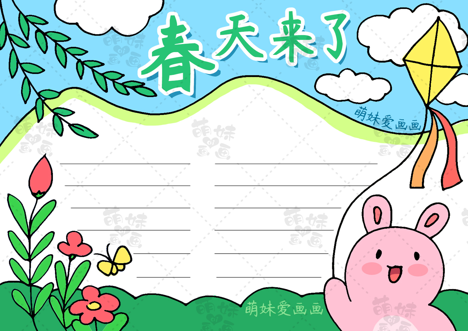 我們在畫面右側繪制一只放風箏的小白兔,用山巒當作手抄報文字框,用花朵和柳條來裝飾,大家喜歡這樣的手抄報嗎?