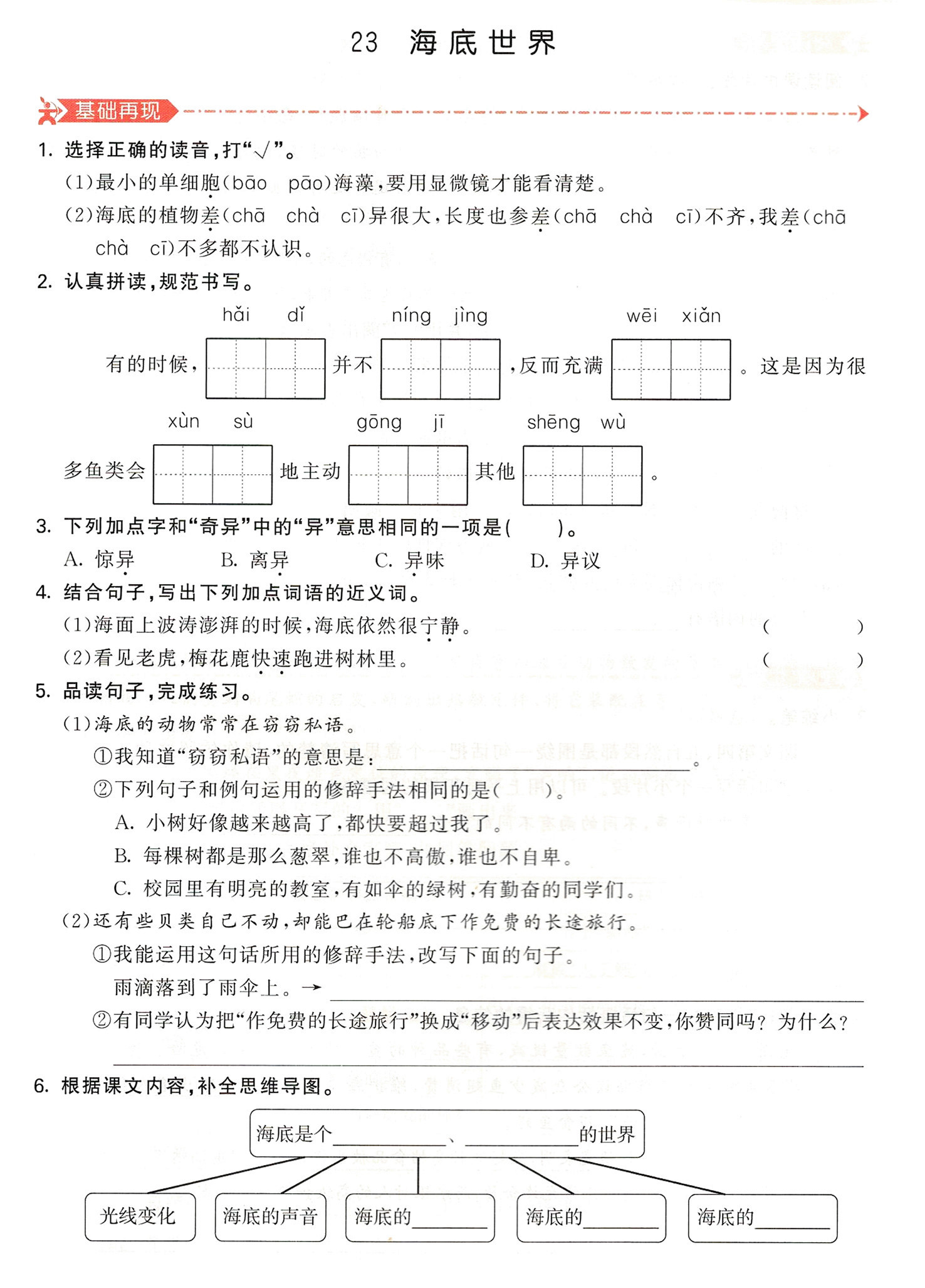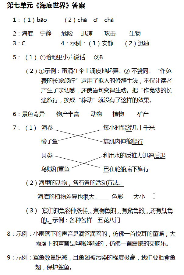 6.本題考查對課文內容的理解。課文最后一個自然段是全文的總結句,我們從中找到“景色奇異”物產豐富”兩個詞語填入上面的橫線處。文章第2、3自然段寫了海面到海底的光線變化和海底的聲音,而第4?6自然段分別寫了海底的動物、植物、礦產。