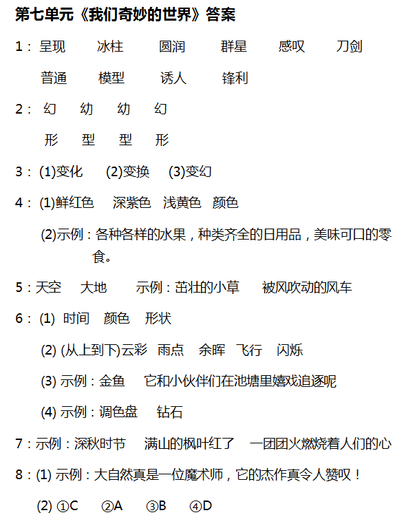 (3)本題考查獲取信息和理解詞語的能力。文中“多種多樣”后面的內容講的都是顏色,也就是對“多種多樣”的解釋,把這句話用“ &34;畫出來即可。“多種多樣”的意思是“多方面的,五花八門&34;,因此和它意思相近的詞語可以是“五花八門、各種各樣”等。