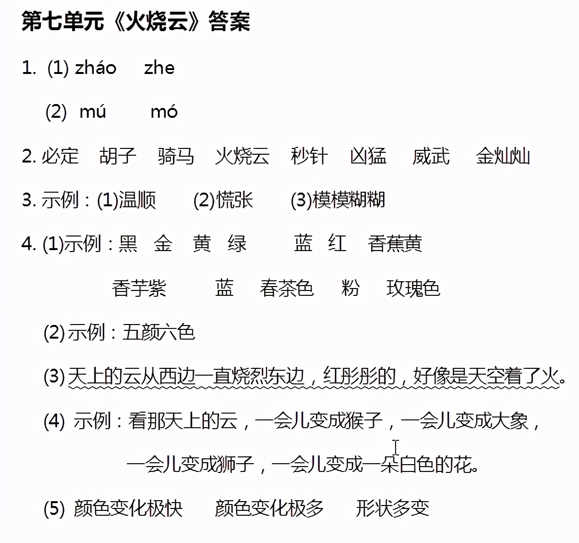 (5)本題考查概括歸納的能力。選文第二自然段從兩個方面寫了火燒云變化極多,另外,課文中還寫到了火燒云的另一個特點是形狀多變。