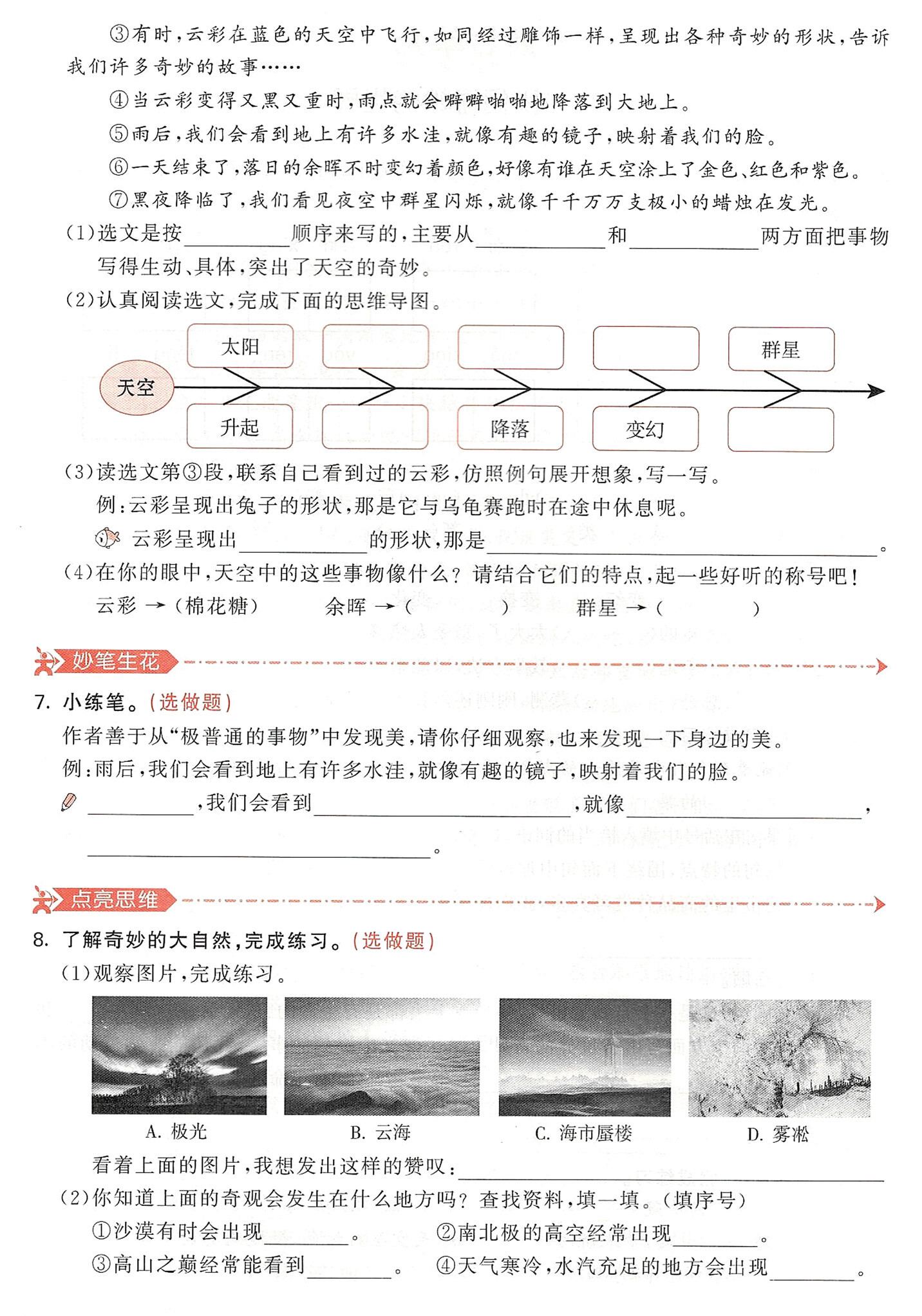 (2本題考查對選文內容的理解。選文中描寫的天空的景物有:太陽、云彩、雨點、余暉、群星。描寫這些景物的詞語分別是:升起、飛行、降落、變幻、閃爍。由此把思維導圖補寫完整即可