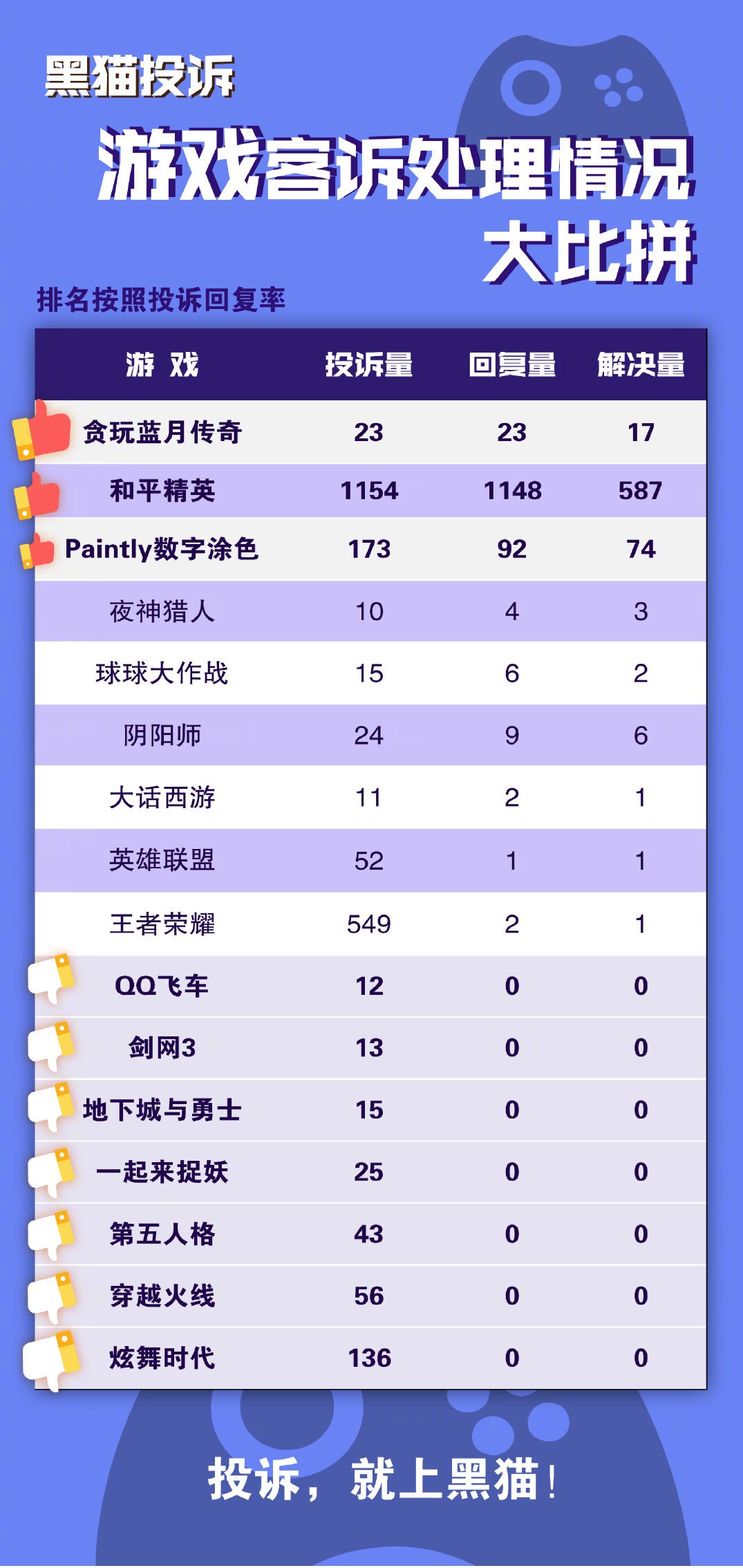 接下去的一些手游比較小,樣本數量也不夠,暫且不提。來看看大家最關心的王者榮耀,投訴量549,但回復量和解決量卻是2和1,回復率不足0.3%。相信找過客服的玩家都感受過那種被支配的恐懼,在自助平臺上基本上是兜兜轉轉又回到了最初,基本上解決不了什么問題。如果有幸找到人工客服,也不一定有權限解決,一般說法是向上層反饋,然后就沒有然后了。