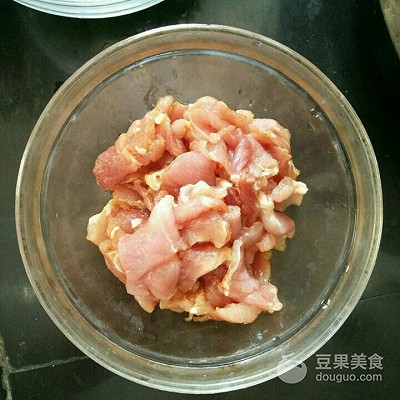 2、豬肉加入料酒、生抽和一點點鹽,攪拌均勻后腌15分鐘。