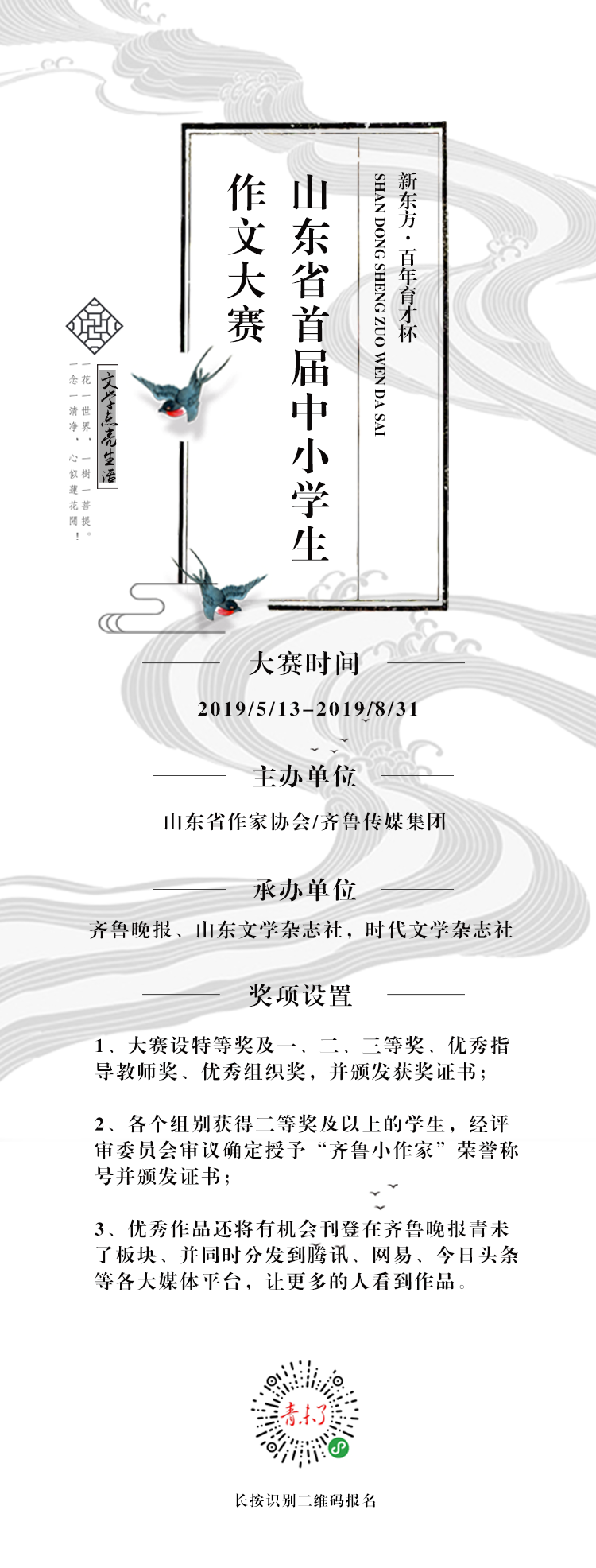 大賽宗旨:由山東省作家協會、齊魯傳媒集團主辦,齊魯晚報、山東文學雜志社、時代文學雜志社承辦的“新東方·百年育才杯”山東省首屆中小學生作文大賽是一項服務于中小學生寫作實踐,引導中小學生進行寫作創新性嘗試的公益性作文競賽活動,自2019年起每年舉辦一屆,今年是第一屆。旨在為全省中小學生搭建高水平寫作平臺,提升中小學生寫作素養,發現文學新苗,助力發展素質教育。大賽積極鼓勵中小學生關注社會變化、生活變遷,感知風土人情、人性之美,抒寫真情實感,展現作文個性,提高人文素養以養成健全人格。