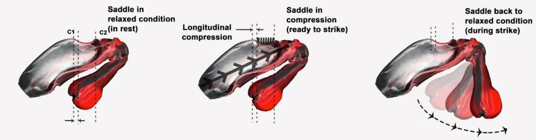 皮皮蝦的“出拳“過程分為三個步驟:休息放松-準備出擊-快速出擊。在沒有獵物時,圖中C1和C2之間像“馬鞍”的凹槽處于松弛狀態的,當發現獵物準備出擊時, “馬鞍”狀凹槽縱向壓縮,積蓄力量,當瞄準目標之后,“馬鞍”狀凹槽立即松弛,將第一節根部瞬間彈出,對獵物實施捕殺。
