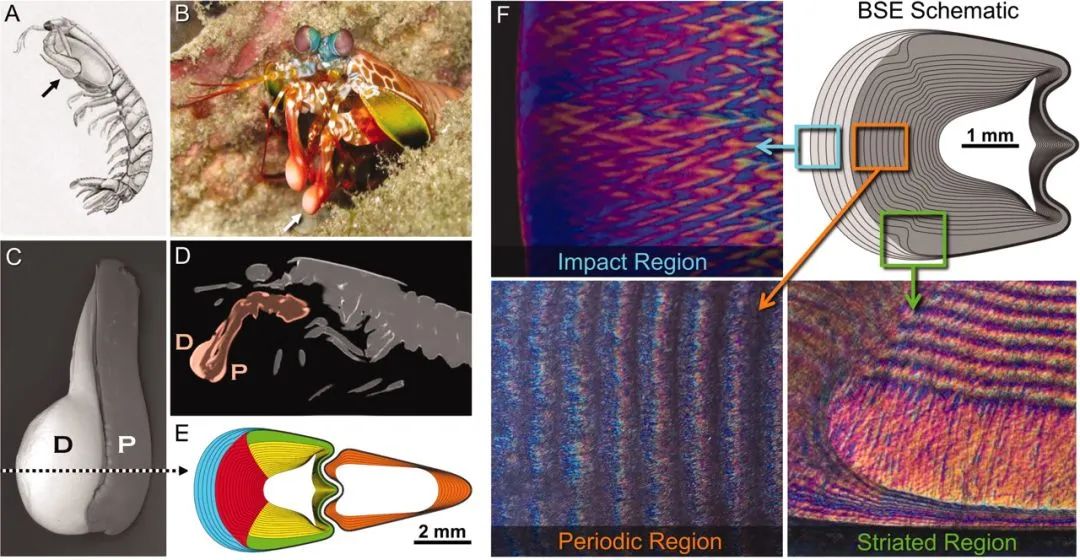 圖5 皮皮蝦形態特征。(A)螳螂蝦的個體。箭頭為第二對顎足。(B)第二對顎足的放大視圖。箭頭表示dactyl club的撞擊表面的位置。(C)dactyl club外部形態的散射掃描電子顯微照片。(D)縱向掃描截面。(E)dactyl club橫截面分析。三個不同的區域:(i)撞擊區域(藍色),(ii)周期區域[進一步細分為兩個不連續的區域:內側(紅色)和側面(黃色),(iii)橫紋區域(綠色)。(F)dactyl club光學顯微照片。分別為撞擊區域、周期區域和橫紋區域。[3]
