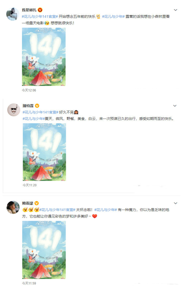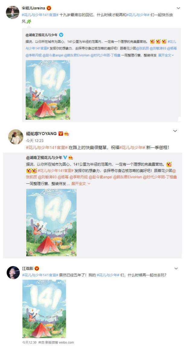 令人驚訝的是:《花兒與少年》第三季的江疏影、古力娜扎、賴雨濛、宋祖兒、楊祐寧、陳柏霖都發文為《花兒與少年4》打call了,太有團魂了吧?時隔5年,新老成員還能一起互動?這應該是湖南衛視的影響力吧。
