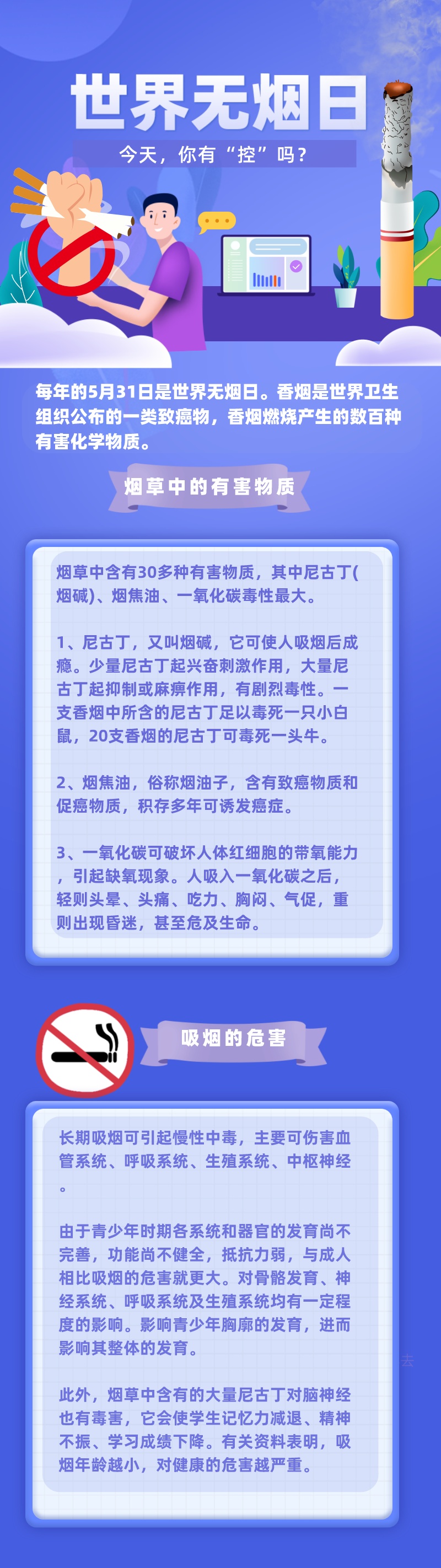導讀每年的5月31日是世界無煙日。香煙是世界衛生組織公布的一類致癌物,香煙燃燒產生的數百種有害化學物質,那么,長期吸煙會對我們身體有哪些危害?煙草中主要的有害物質都有哪些?一起來看看吧!(沙芳如)來源