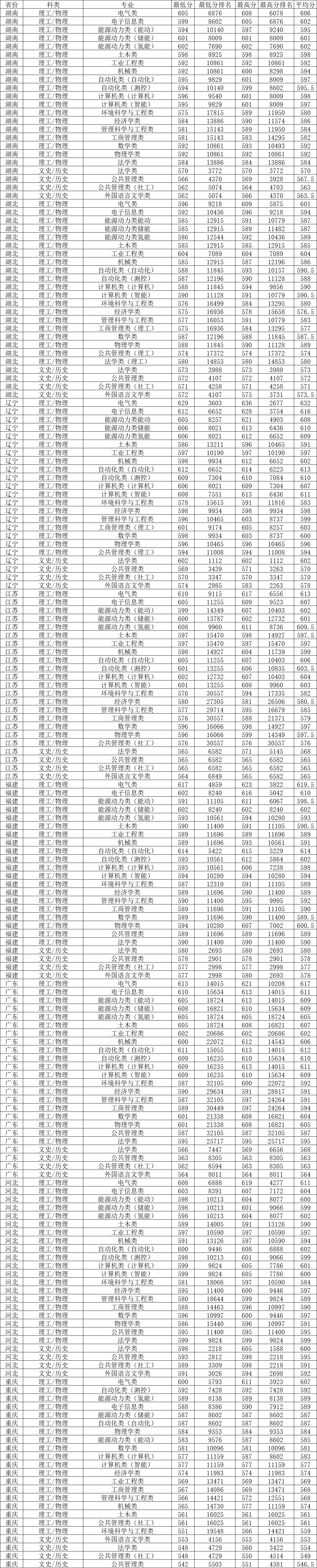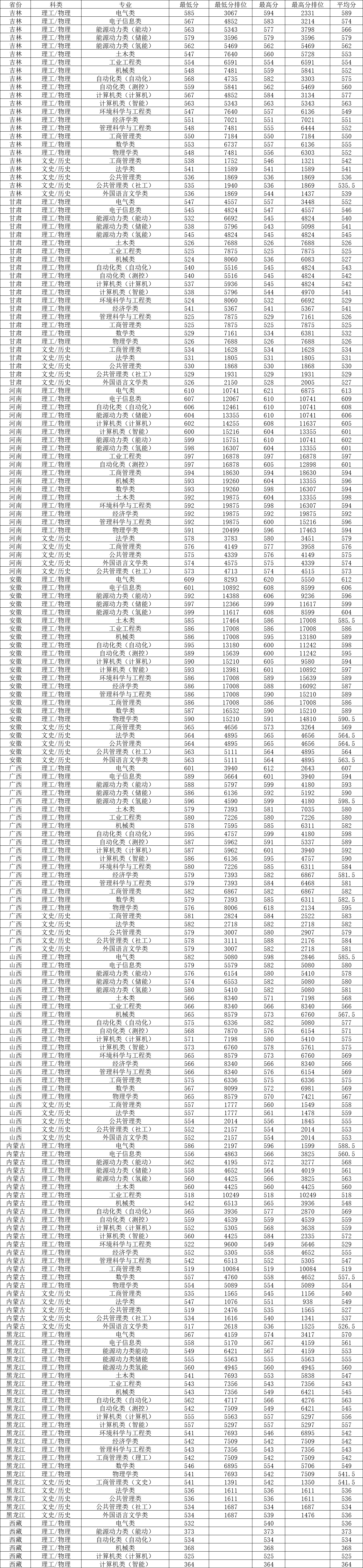 在河南本科一批物理類錄取分數線較高的專業:電氣類610分、電子信息類607分、自動化類(自動化)606分、能源動力類(儲能)604分、計算機類(計算機)602分、計算機類(智能)600分,錄取最低分592分,最低位次19875.文史類最高的是法學類578分,最低的是公共 管理類(社工)573分,最低位次4713.