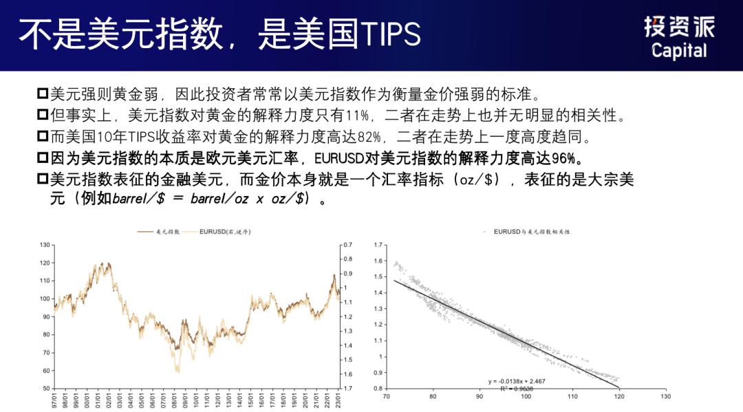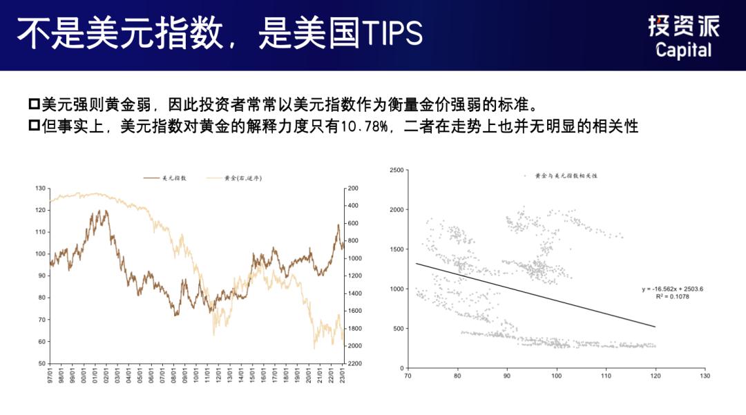所以在第一步的研究過程當中,投資者就會發現,與其說黃金跟美元掛鉤,倒不如說跟Tips、跟美國的剔除通脹的債券指標相對掛鉤的解釋度會更高一些。