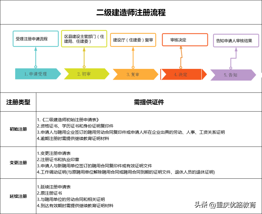 導讀二建上岸的同志又不知道證書該如何注冊的人,看這條內容就夠啦首先我們說一下注冊流程1.申請受理2.區縣建設主管部門 初審3.建設廳 復審4.決定5.告知二級建造師證書注冊類