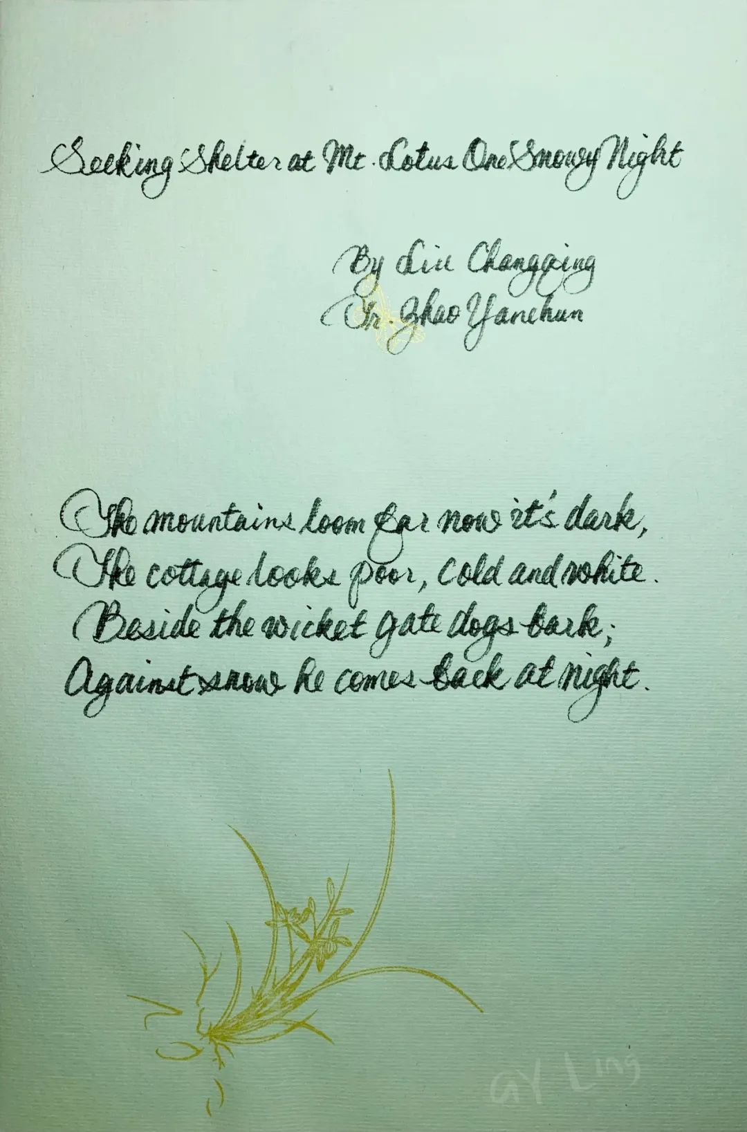 LIU Zhangqing (birth & death years unknown), styled Study, a Han Chinese, born in Xuancheng (in present-day Anhui Province). A poet of the middle Tang dynasty, he was good at composing poems, especially those with five-syllabic lines. Liu described himself as a &34;Great Wall of Poems with Five-Syllabic Lines&34; (溫建英 譯)