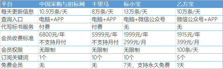 - 會員權限方面中國采購與招標網、千里馬、標小寶相同,乙方寶每天還有100條的限制
