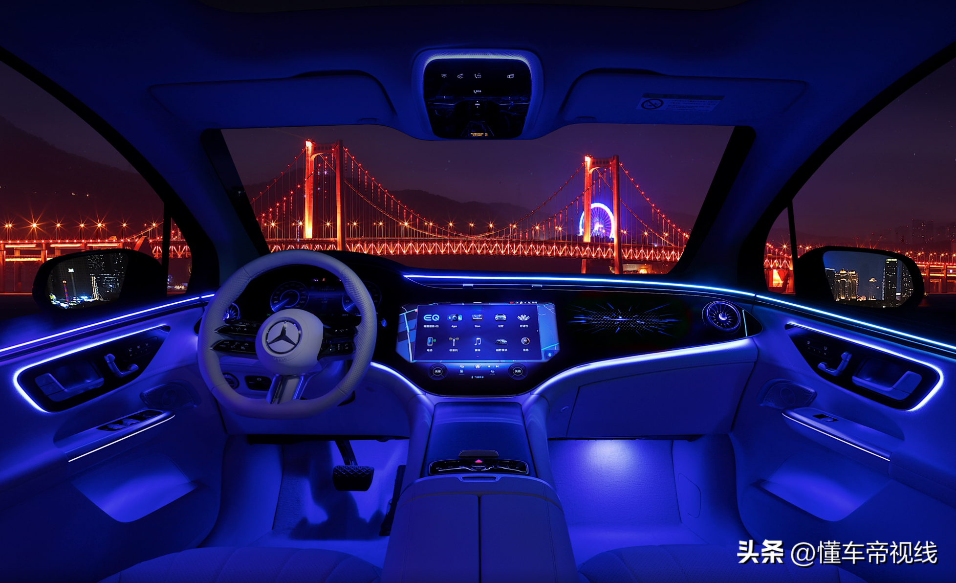 配置方面,EQE SUV配備有主動式環境氛圍燈,其可根據車輛加速、勻速等不同行駛狀態,動態呈現不同的燈光效果。同時,還配備有發光星標、動態發光迎賓燈和發光迎賓踏板。模擬聲浪可根據12種車輛參數,實現動態的模擬聲浪效果。車載導航方面,EQE SUV配備有帶AR實景穿越導航的高德定制導航。